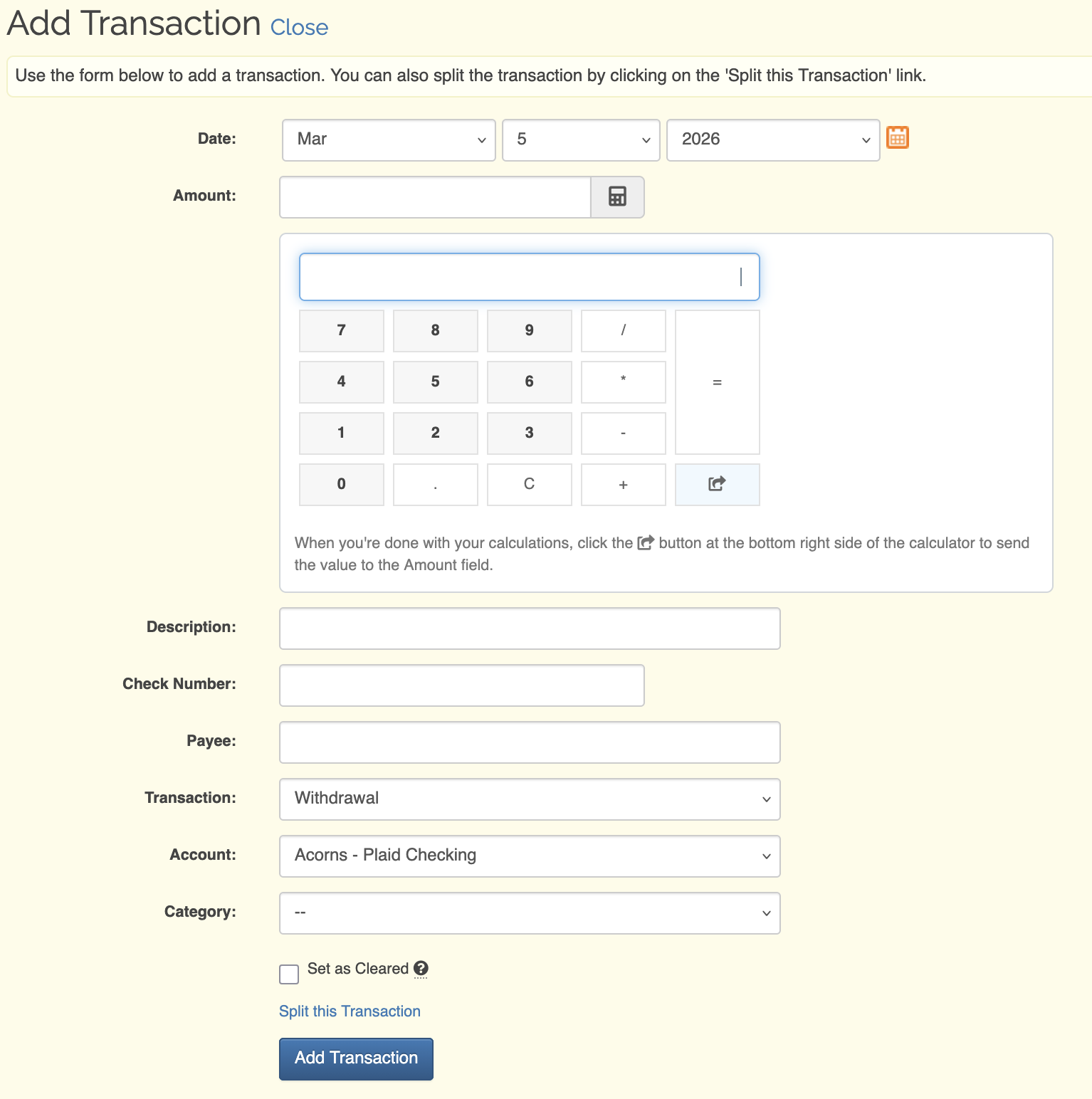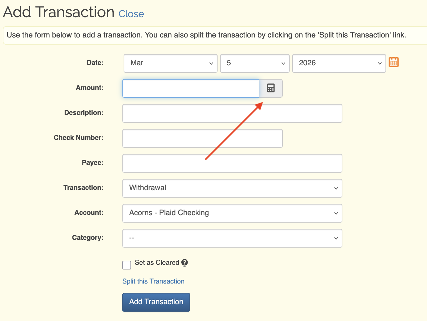 Disabled (default) or Enabled When this setting has the Enabled option selected, a calculator icon will appear in the Amount field when adding transactions. Clicking on this calculator icon will bring up a basic calculator to help you if you need to do some math to figure out what the amount should be.