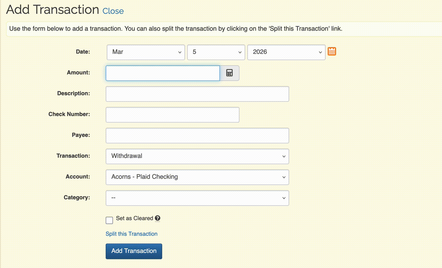 The options areDisabled (default) or Enabled This option determines whether the Set as Cleared checkbox on the Add Transaction form is selected by default when adding new transactions. If you set this option to Enabled, the Set as Cleared option will be selected by default. This setting is useful if you're adding a lot of transactions that have already cleared with your bank.