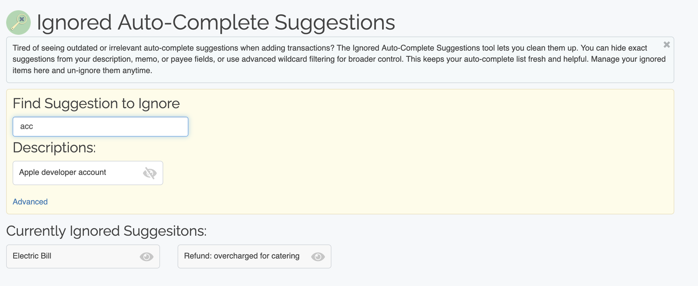 Ignore description, memo and payee suggestions |